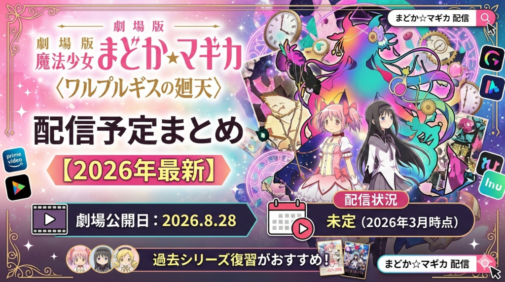 『劇場版 魔法少女まどか☆マギカ ワルプルギスの廻天』配信予定まとめ【2026年最新】 『劇場版 魔法少女まどか☆マギカ〈ワルプルギスの廻天〉』の動画配信がいつから始まるのか気になっている方へ。結論として、2026年3月時点で配信開始日は未定です。劇場... -