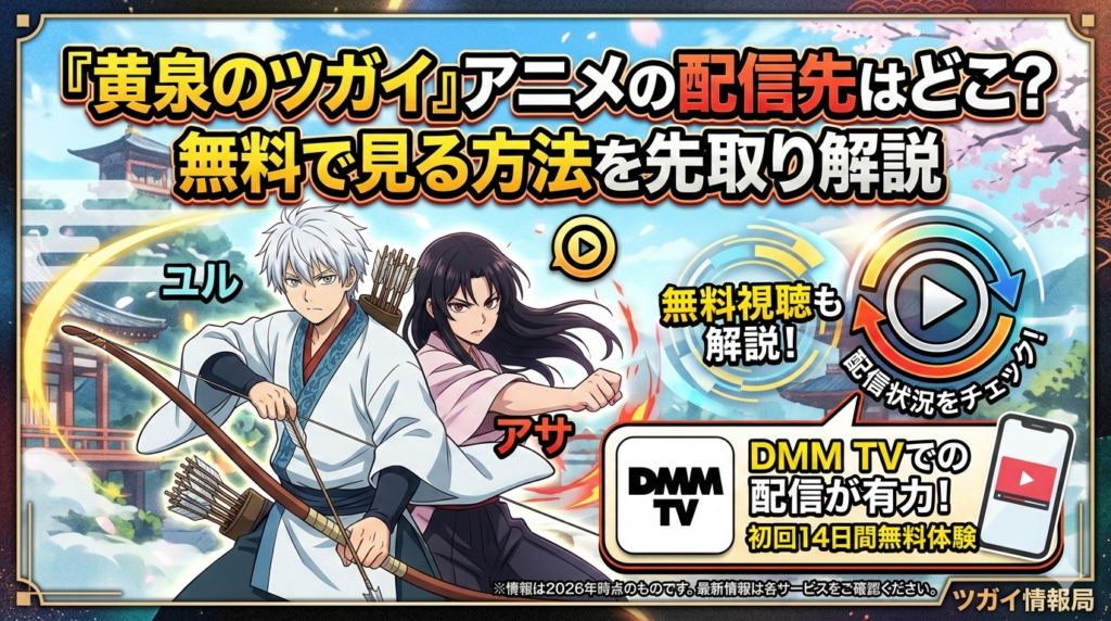 『黄泉のツガイ』のアニメは2026年4月4日より放送開始の注目作品です。「どこで配信されるの?」「無料で見る方法はある?」という疑問を持つ方に向けて、配信状況や無料視聴の方法をいち早く解説します。結論としては、DMM TVでの配信が有力であり、初回1... -
