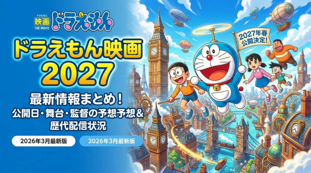 ドラえもん映画2027の最新情報まとめ|公開日・舞台・監督の予想と歴代作品の配信先を徹底解説【2026年3月最新】 2027年春に公開が決定した映画ドラえもん最新作(シリーズ第46作目)の情報をお探しですか?本記事では、2026年3月9日時点で判明している公... -