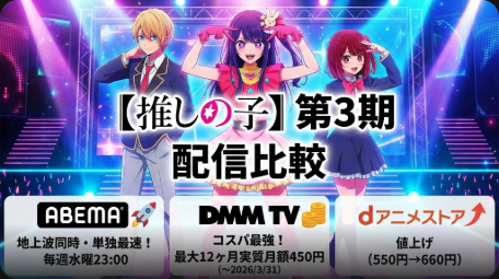 「【推しの子】第3期」の配信を徹底比較!ABEMAは地上波同時の最速配信で無料視聴可能。dアニメストア・DMM TVとの料金・機能の違いを解説します。 -
