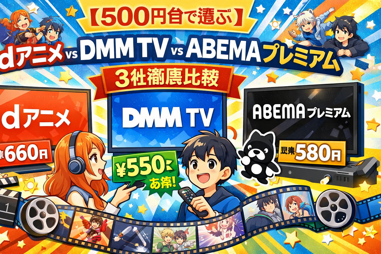 「アニメをできるだけ安く、たくさん見たい」――そんな願いを叶えてくれるのが月額500円台のアニメサブスクです。しかし2026年2月、dアニメストアが月額660円に値上げされたことで、500円台の勢力図が大きく変わりました。結論から言えば、コスパ・作品の幅広さ・機能のバランスすべてにおいて、現在もっともおすすめなのはDMM TV(月額550円)です。