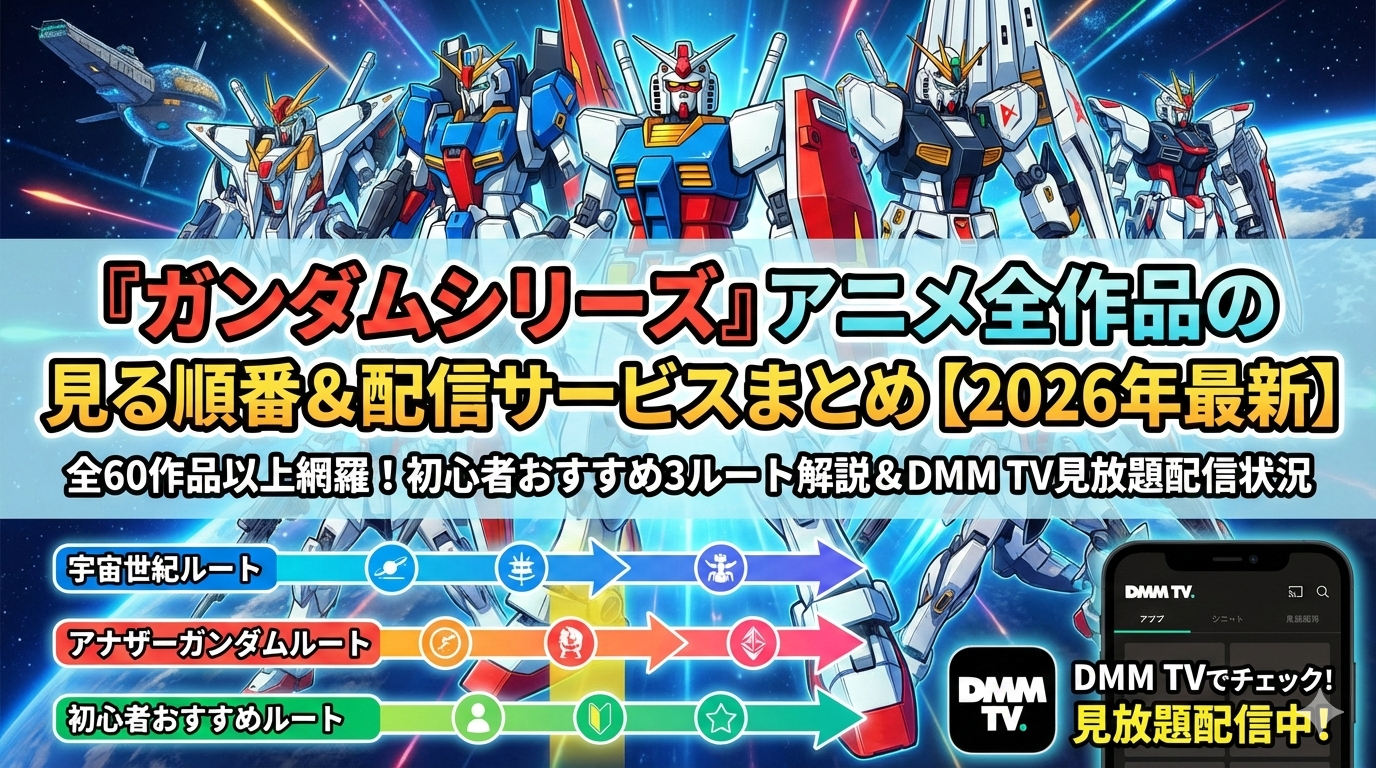ガンダムシリーズは1979年の『機動戦士ガンダム』から始まり、2026年2月現在までにTVアニメ・OVA・劇場版を合わせて60作品以上が制作されています。映画『閃光のハサウェイ キルケーの魔女』が2026年1月に公開され興行収入20億円を突破するなど、シリーズ人気は過去最高レベルです。この記事では、初心者が迷わないおすすめの見る順番を3つのルートに分けて解説し、全作品を月額550円(税込)で視聴できるDMM TVの配信状況をまとめました。