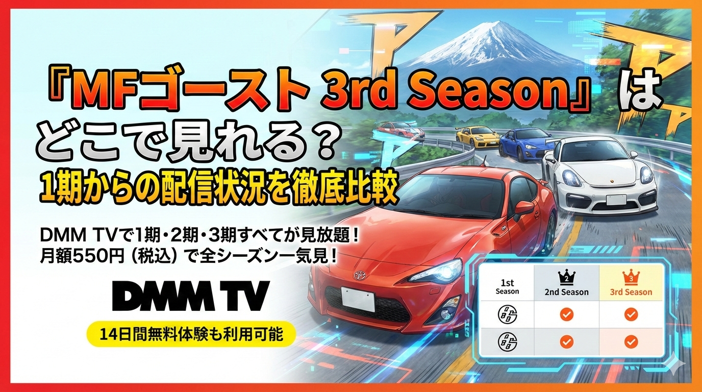 2026年2月16日時点で、アニメ『MFゴースト 3rd Season』はDMM TVにて見放題配信されています。1st Season(全12話)・2nd Season(全12話)に加えて、現在放送中の3rd Season(Turn25〜)も毎週水曜0:00より順次配信中です。DMM TVなら月額550円(税込)で全シーズンを通して視聴でき、初めて登録する方は14日間無料で全話を楽しめます。