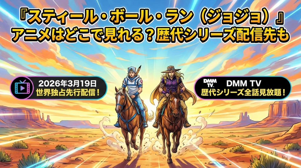 アニメ『スティール・ボール・ラン ジョジョの奇妙な冒険』(7部)は、2026年3月19日より世界独占先行配信が決定しています。一方、ジョジョ歴代シリーズ(1部〜6部)はDMM TVで全話見放題で視聴できます。この記事では、7部の最新配信情報と歴代シリーズ... -