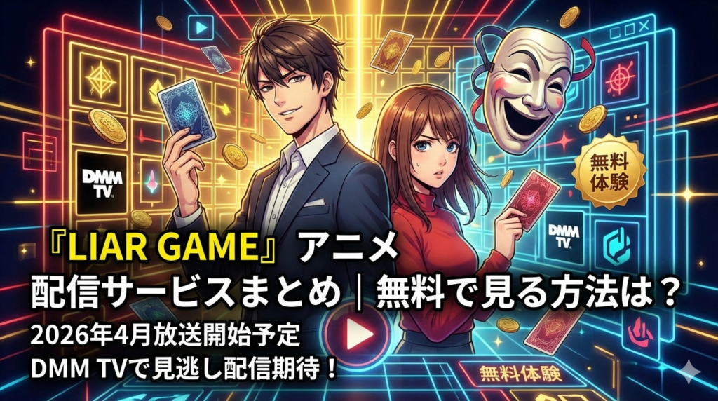 『LIAR GAME』アニメ 配信サービスまとめ|無料で見る方法は? TVアニメ『LIAR GAME -ライアーゲーム-』は2026年4月よりテレ東系列・BSテレ東にて放送開始予定の新作アニメです。現時点ではまだ放送前のため配信は始まっていませんが、放送開始後はDMM TV... -