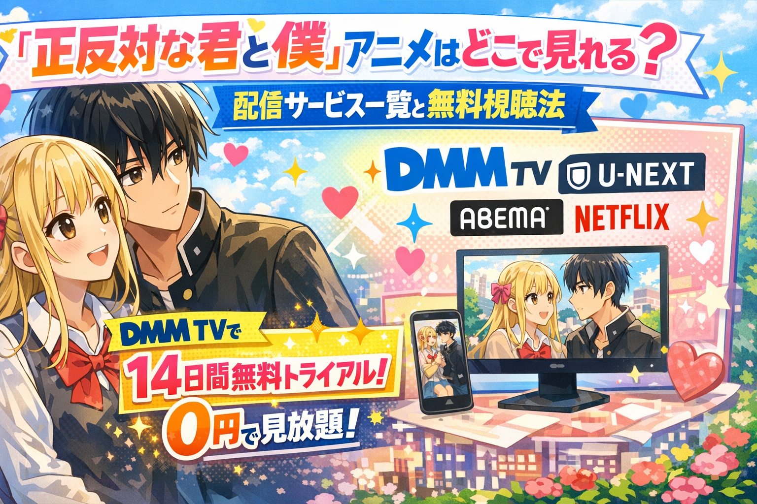 TVアニメ『正反対な君と僕』はDMM TVで全話見放題配信中です。DMM TVなら月額550円(税込)で視聴でき、初回14日間の無料体験を利用すれば、配信中のエピソードを0円で楽しめます。ここでは配信状況の詳細や無料で視聴する方法、作品の魅力まで徹底解説します。