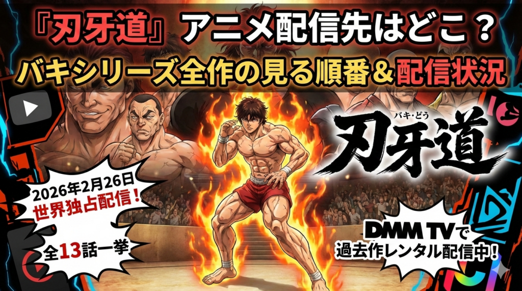 アニメ『刃牙道』の配信先・DMM TVでの視聴可否を徹底解説。バキシリーズ全5作品の見る順番や各作品の配信状況、原作漫画との対応表まで2026年2月最新情報でまとめました。初回14日間無料のDMM TVで過去作の予習も可能です。
