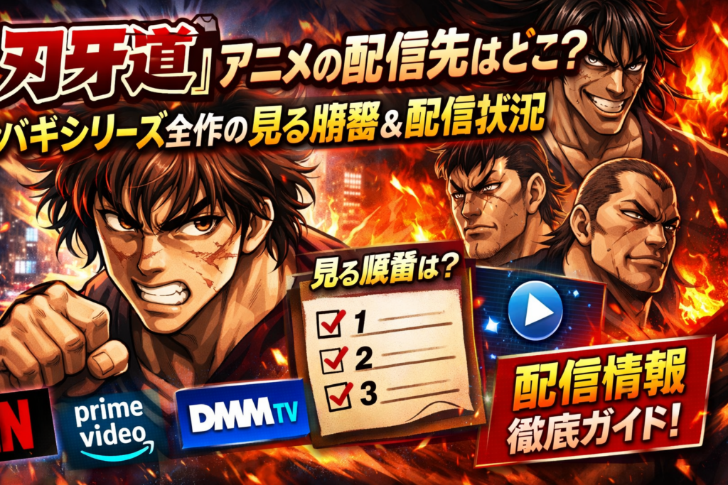 アニメ『刃牙道』の配信先・バキシリーズ全作品の見る順番・各配信サービスでの配信状況を徹底解説。全13話一挙配信の最新情報やファンの口コミ、DMM TVで過去作を視聴する方法もまとめました。