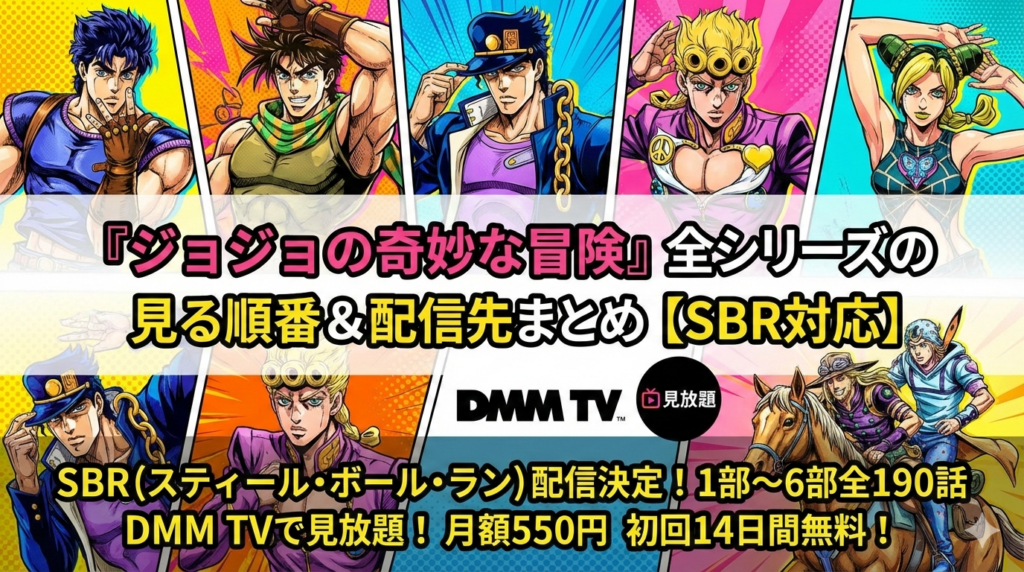 ジョジョの奇妙な冒険アニメ全シリーズの見る順番を解説。第1部〜第6部の全190話はDMM TVで見放題。2026年3月19日配信開始の第7部スティール・ボール・ランの最新情報やファンの口コミもまとめました。
