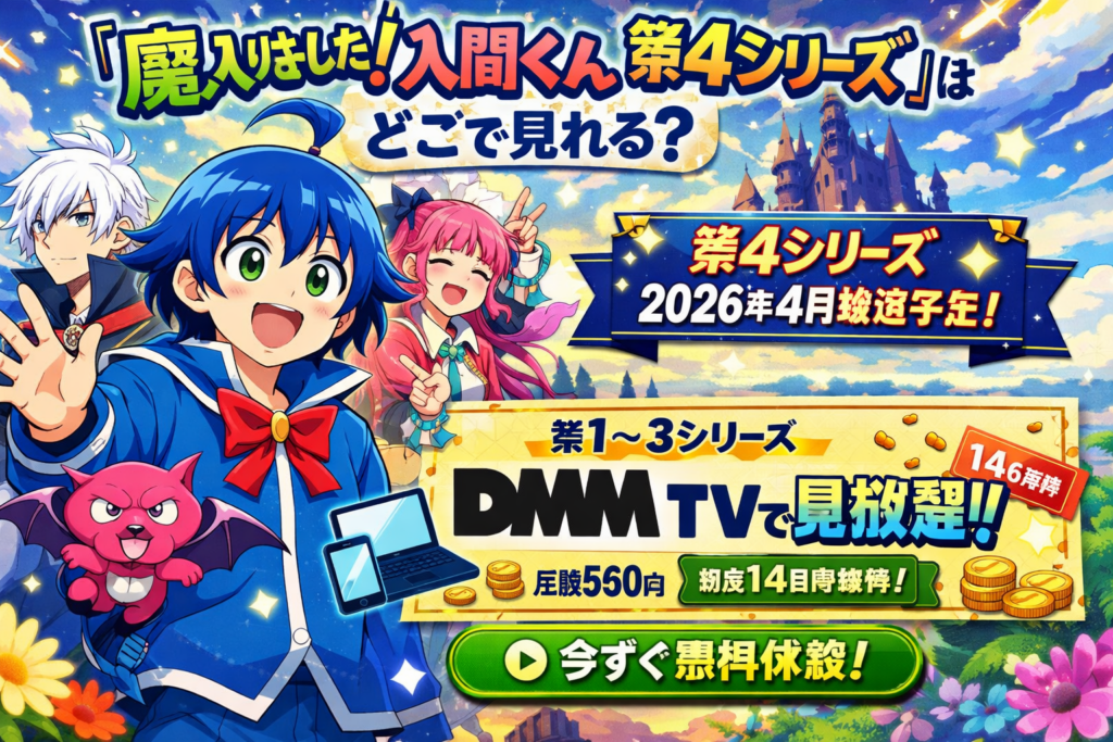 『魔入りました!入間くん 第4シリーズ』は2026年4月よりNHK Eテレで放送開始予定。第1〜3シリーズ全65話はDMM TVで見放題配信中。月額550円・初回14日間無料で放送前の一気見に最適です。配信状況・見る順番・キャストを徹底解説。 -