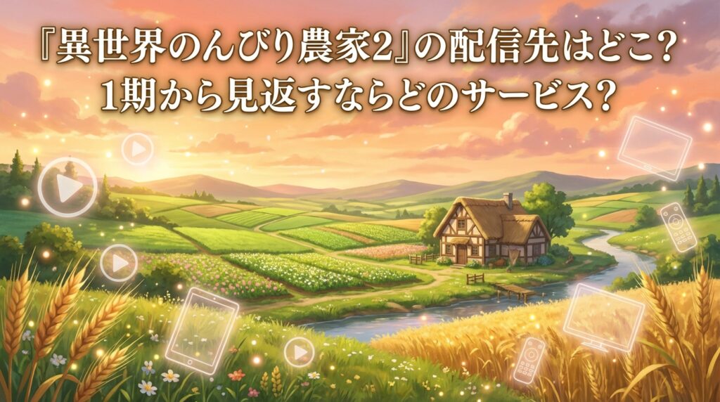 2026年4月放送開始のTVアニメ『異世界のんびり農家2』の配信先情報をまとめました。2期の国内見放題配信は独占のため、DMM TVでは未定。ただし1期全12話はDMM TVで見放題配信中。月額550円・初回14日間無料で2期前に予習できます。 -