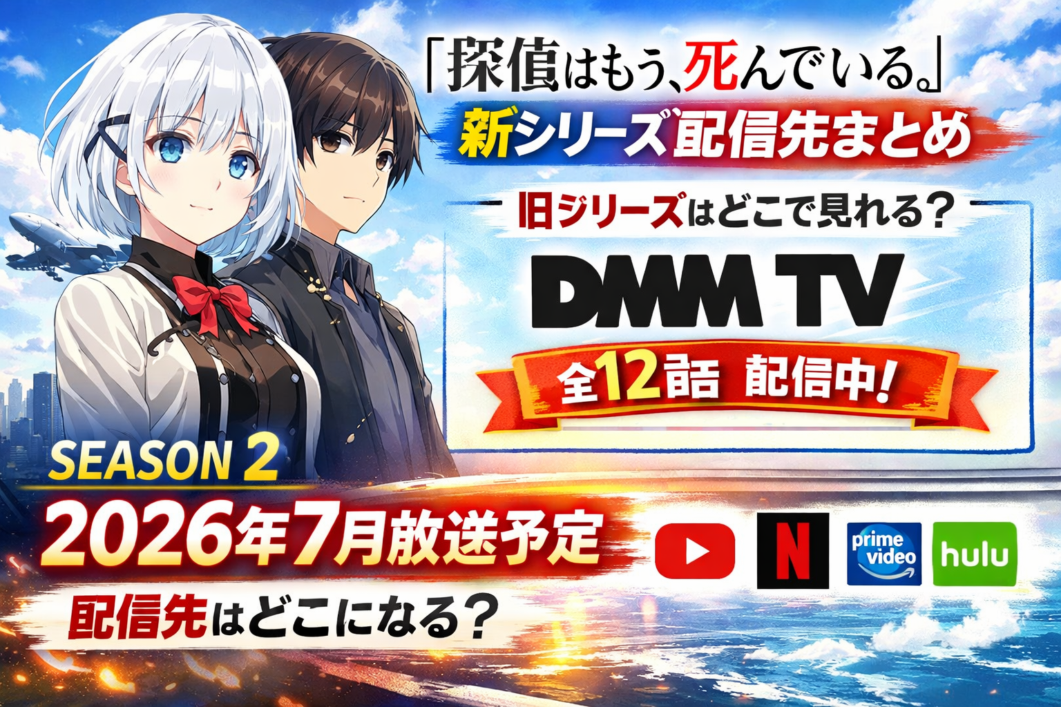 『探偵はもう、死んでいる。』(たんもし)のSeason2が2026年7月に放送開始予定です。新シリーズの配信先は公式未発表ですが、Season1はDMM TVで全12話が見放題配信中。月額550円(税込)・初回14日間無料のDMM TVなら、放送前にSeason1を無料で一気見できます。