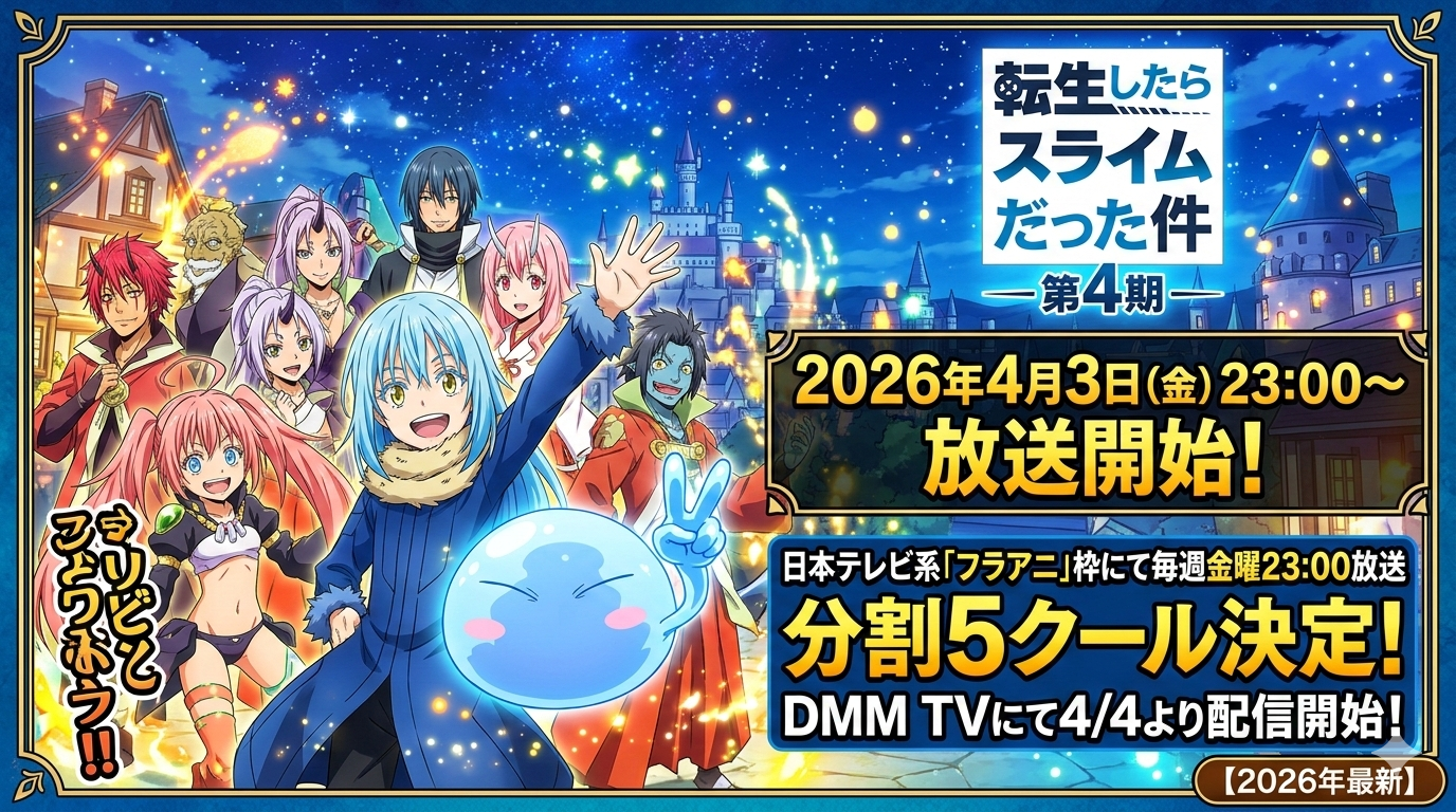 転スラ(転生したらスライムだった件)第4期の放送日は2026年4月3日(金)に決定しました。日本テレビ系「フラアニ」枠にて毎週金曜23:00から放送開始となり、まずは連続2クールで展開されます。さらに第4期は分割5クールという前代未聞のビッグプロジェクトとして発表されており、ファンにとっては長く楽しめる大型企画です。配信はDMM TVをはじめとした各サービスで2026年4月4日(土)23:00より順次スタートします。